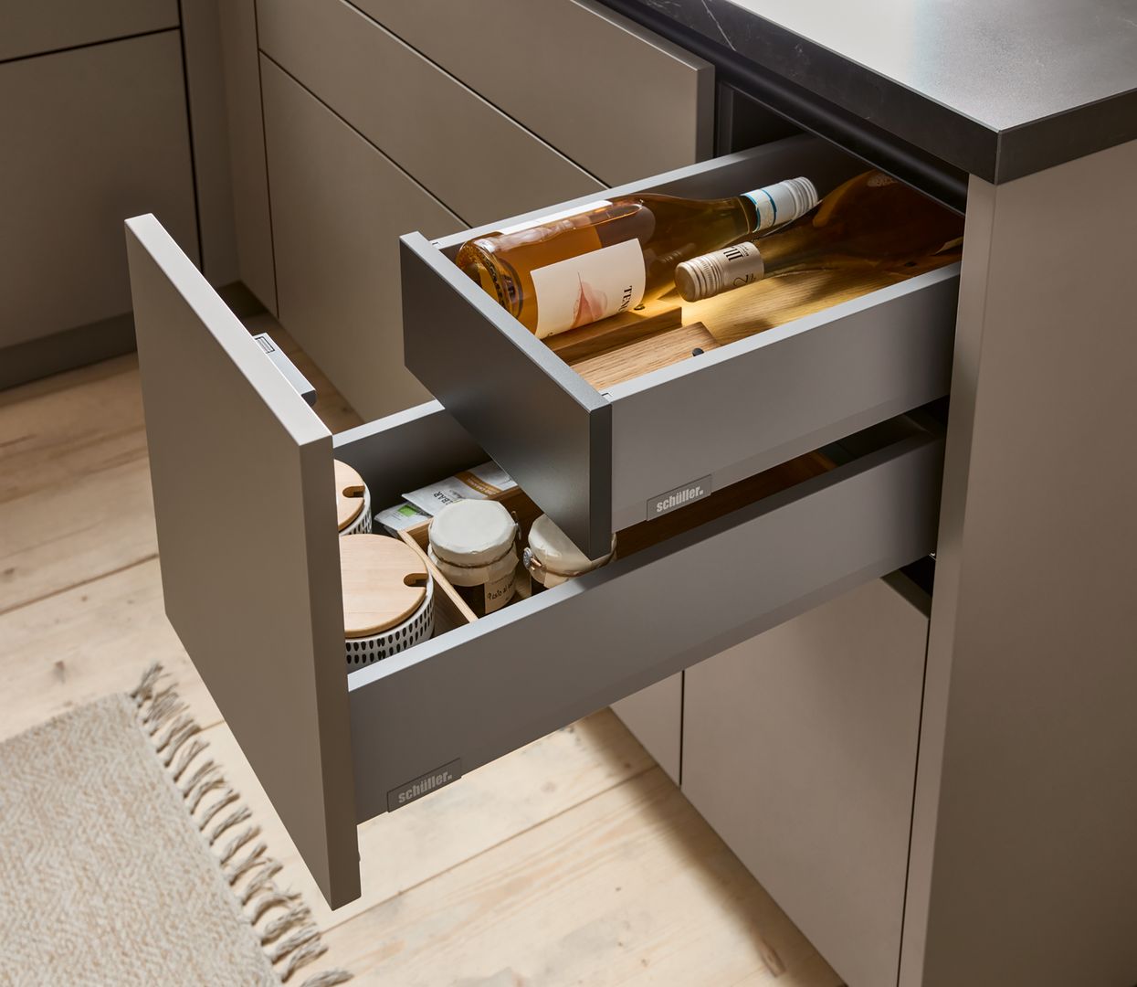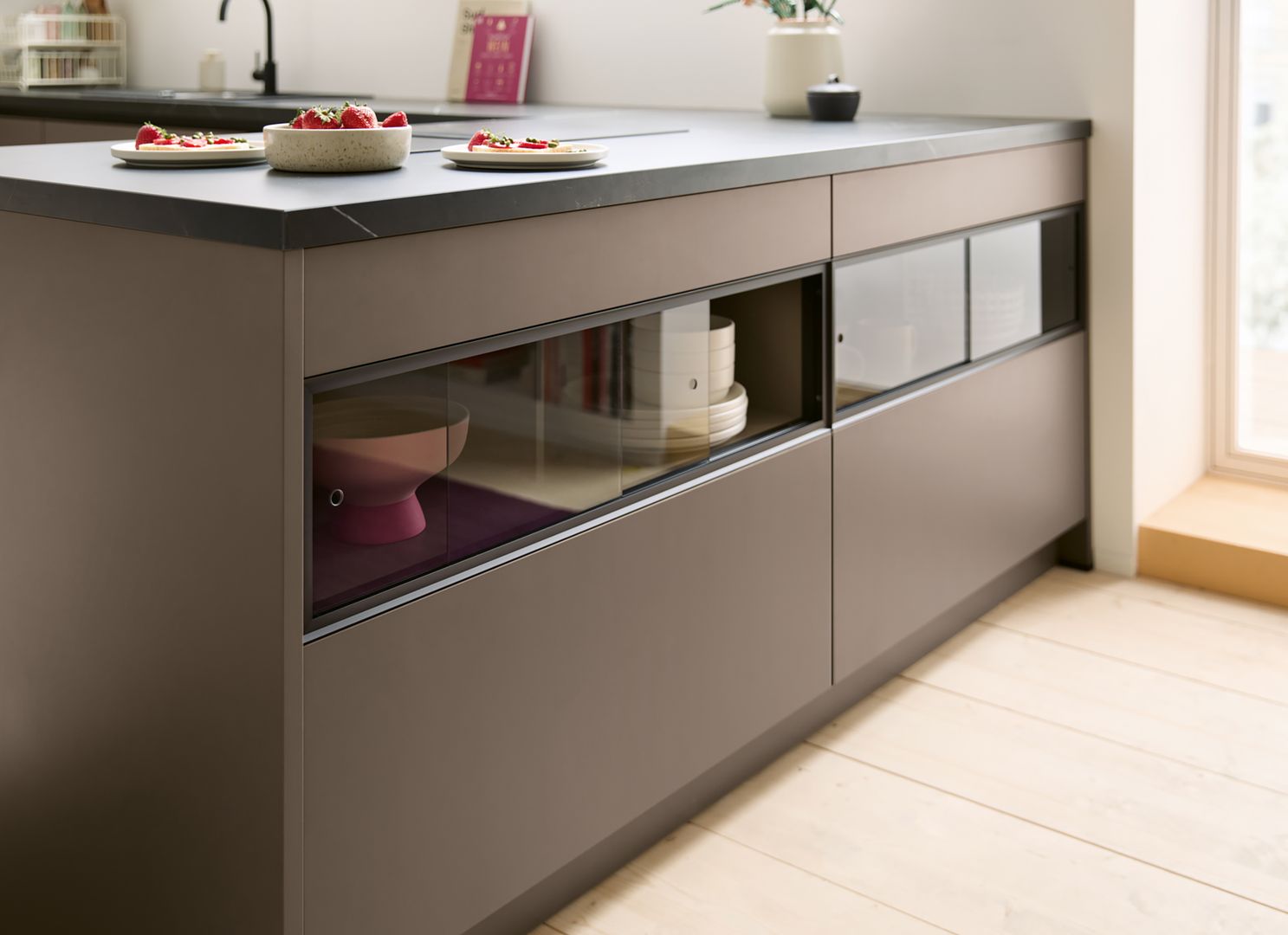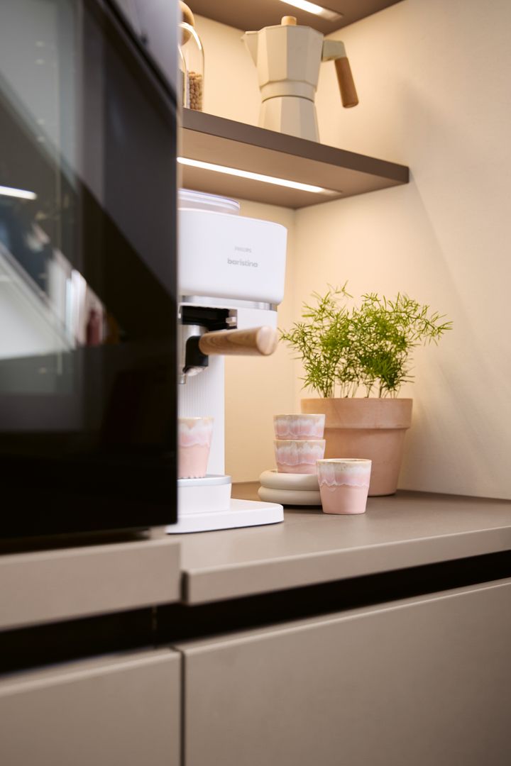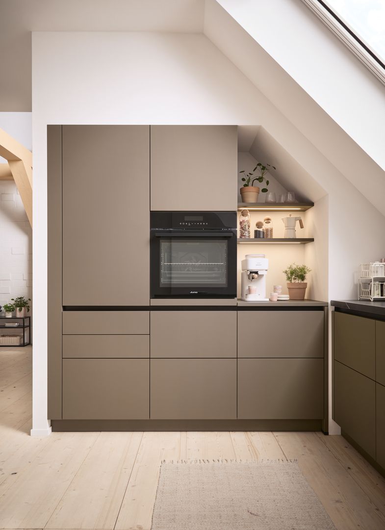 Die wandhängenden Schränke in warmem Sepiabraun schaffen eine leichte Atmosphäre und bieten ausreichend Stauraum. Mit dem Blick über die Stadt im Apartment mit Dachschräge duftet es morgens nach Kaffee – zubereitet auf der dunkel, edlen Arbeitsplatte in Marmor nero Nachbildung in einer Kaffeetasse aus dem Regal mit Glasschiebetür. Offenheit und Leichtigkeit strahlt die schräg eingepasste Küche aus und lädt zu spannenden Gesprächen um die Küchen-Halbinsel herum ein. Durch die Tip-On-Mechanik lassen sich Auszüge und Türen auch mit vollen Händen öffnen – das Highlight: die nachhaltige Front in Matera Colour mit Anti-Fingerprint-Eigenschaft hinterlässt keine Spuren vom Öffnen oder Schließen der Schränke.