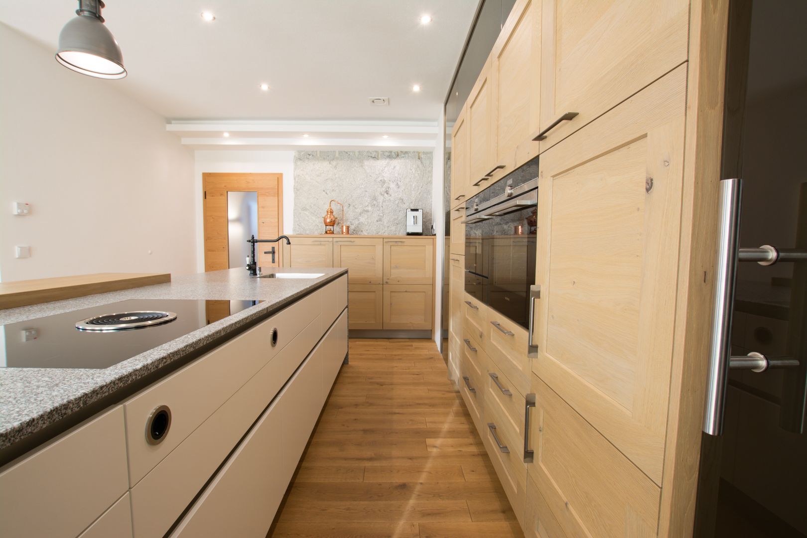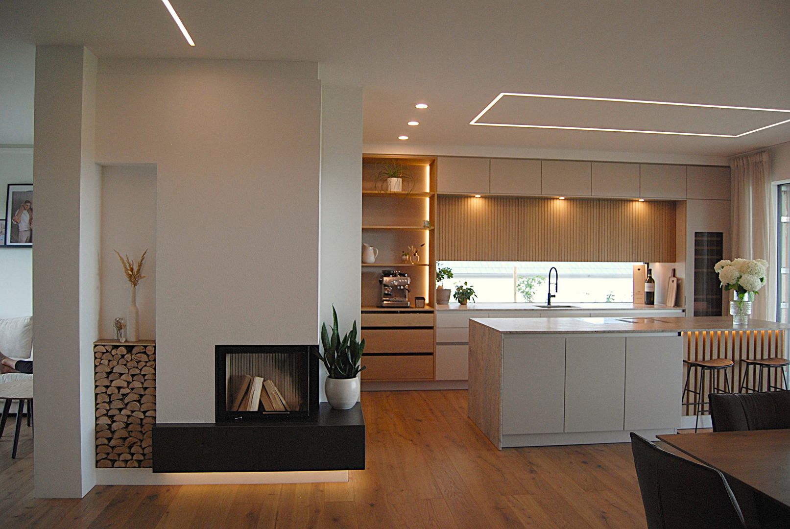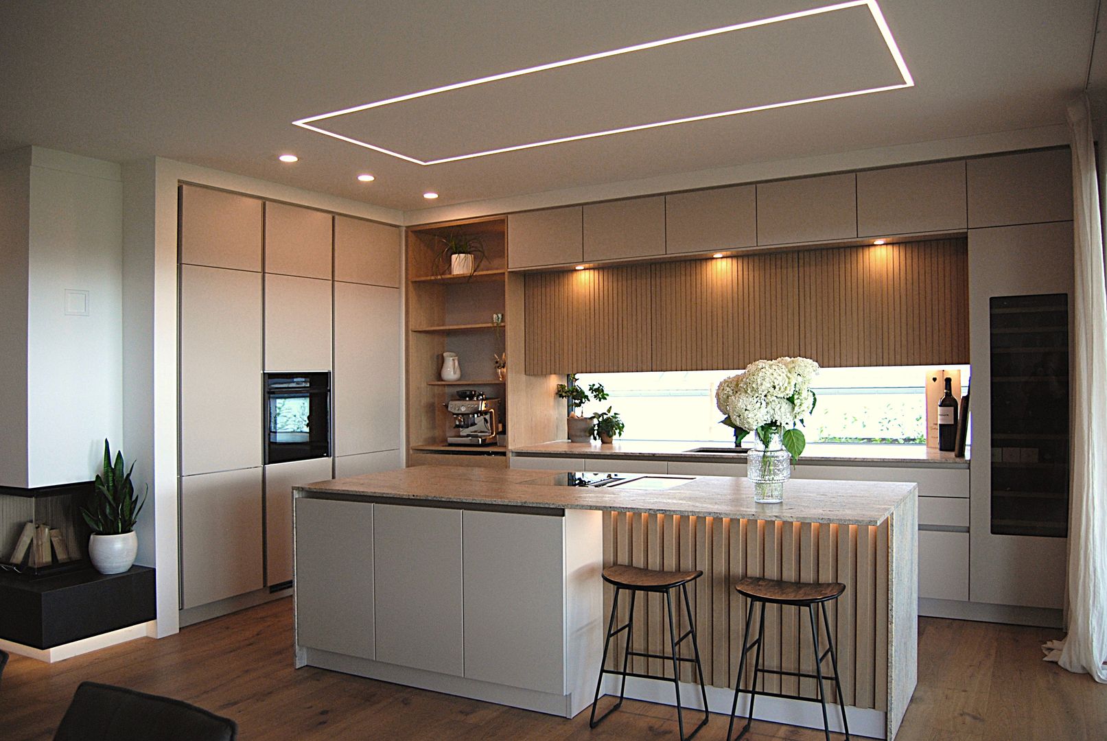 Puristische Holzküche mit raffinierter Griffplanung