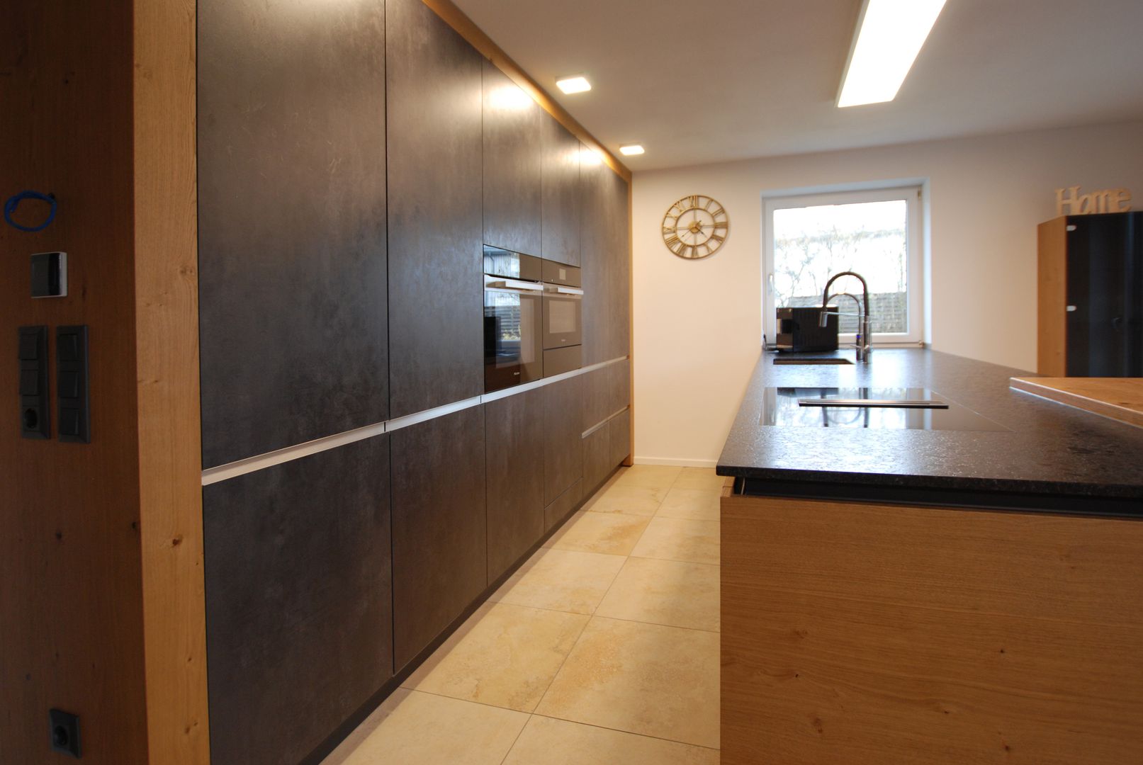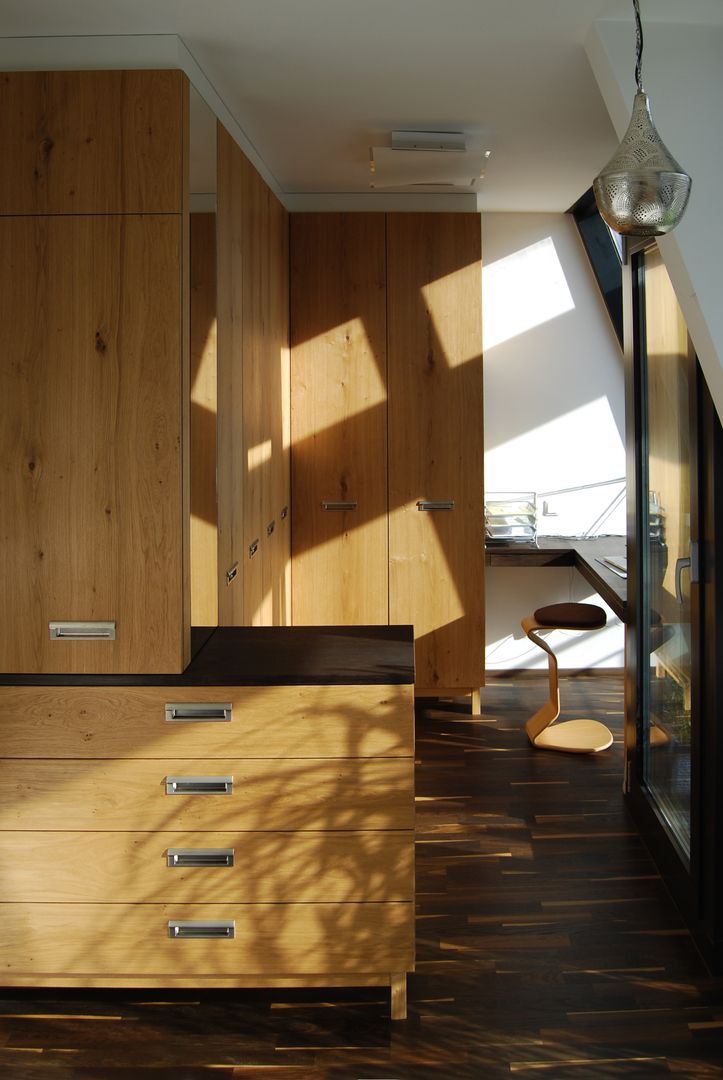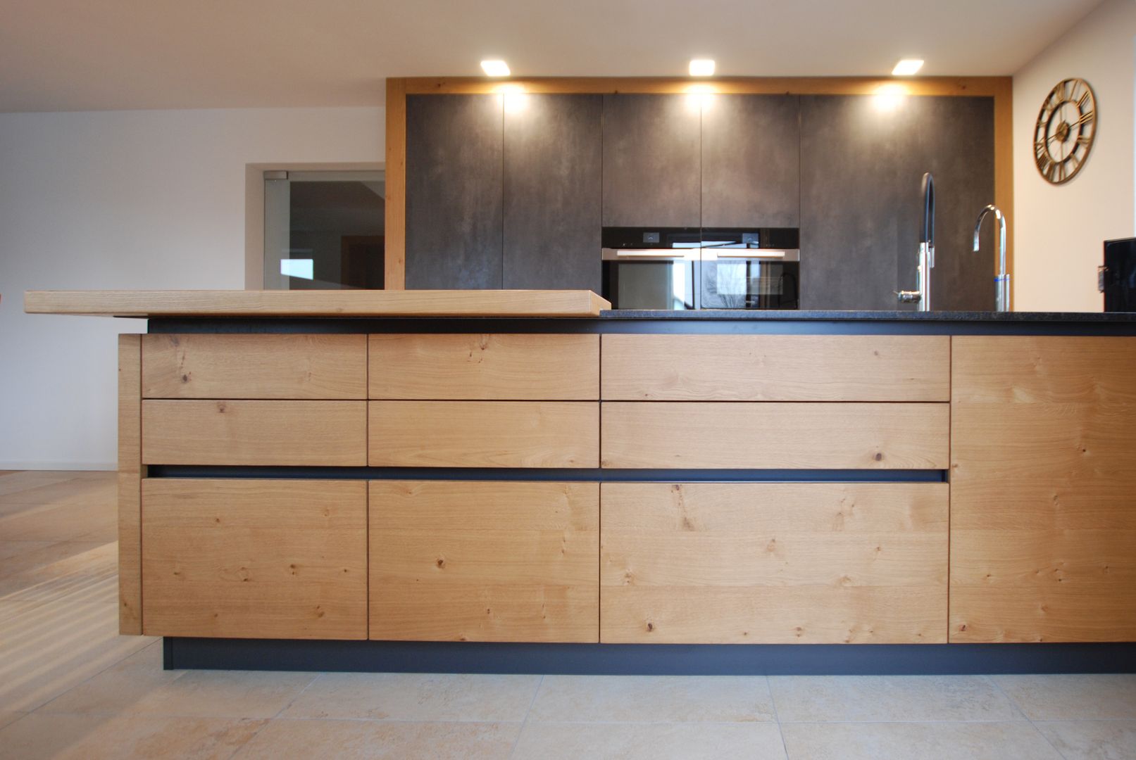 Puristische Holzküche mit raffinierter Griffplanung