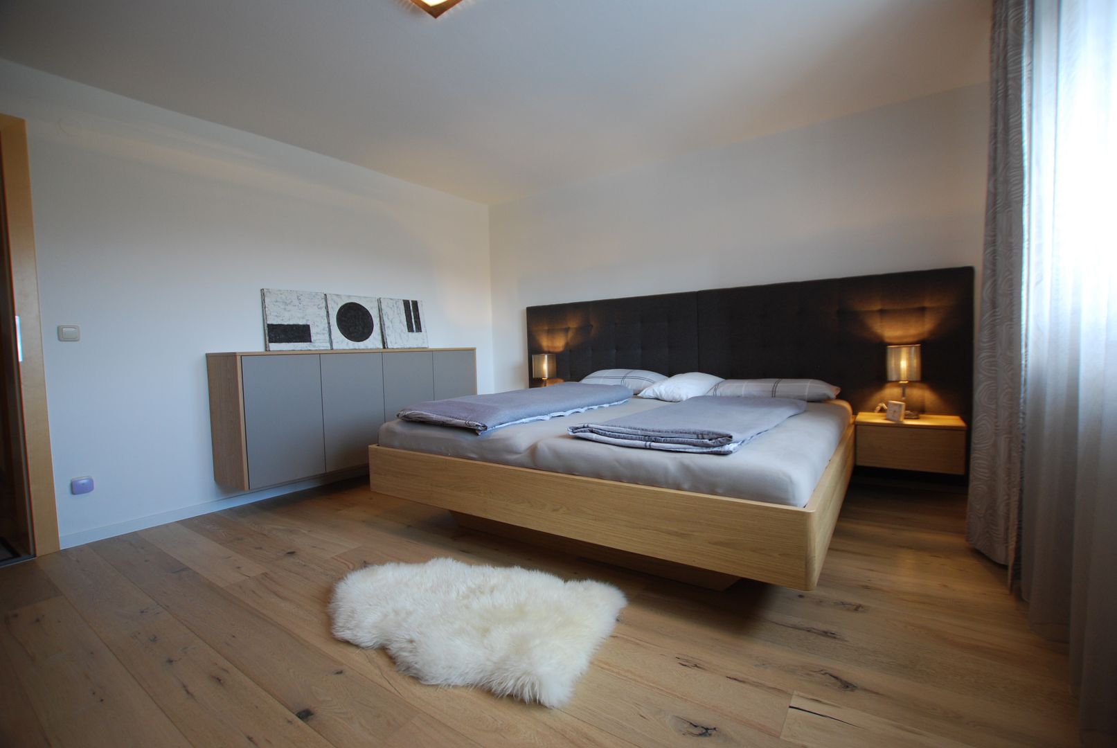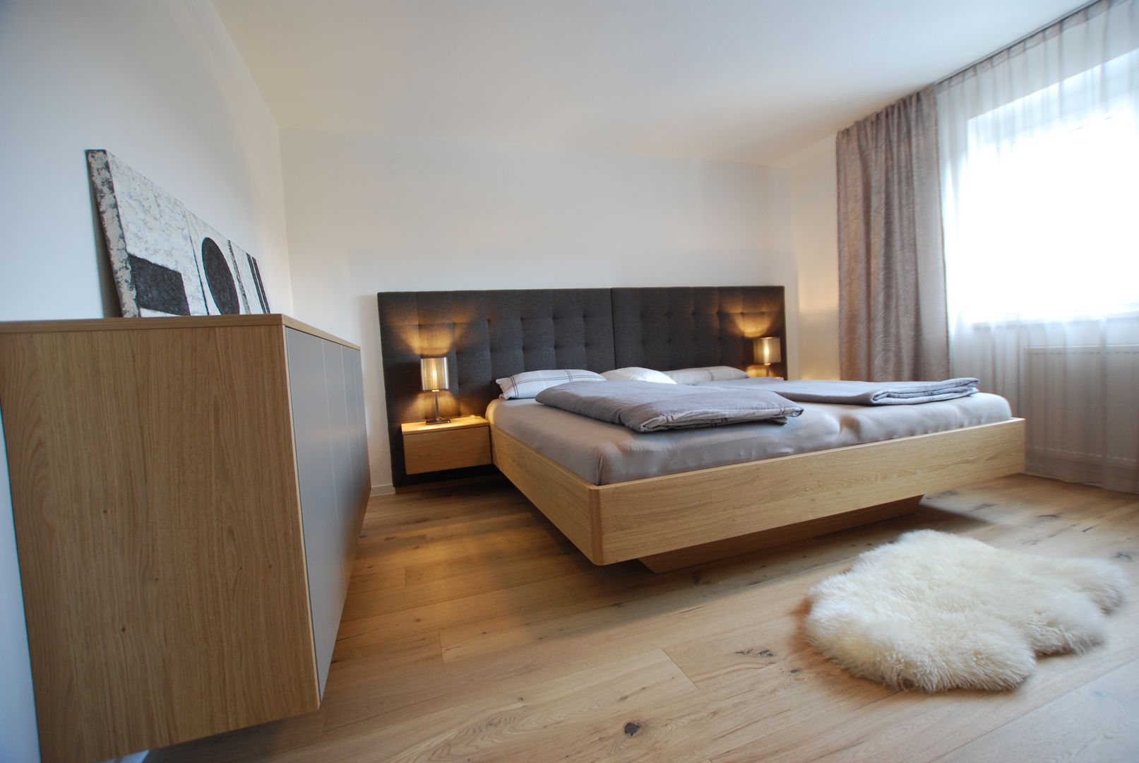 Bett mit schwebender Optik und gestepptem Kopfhaupt
