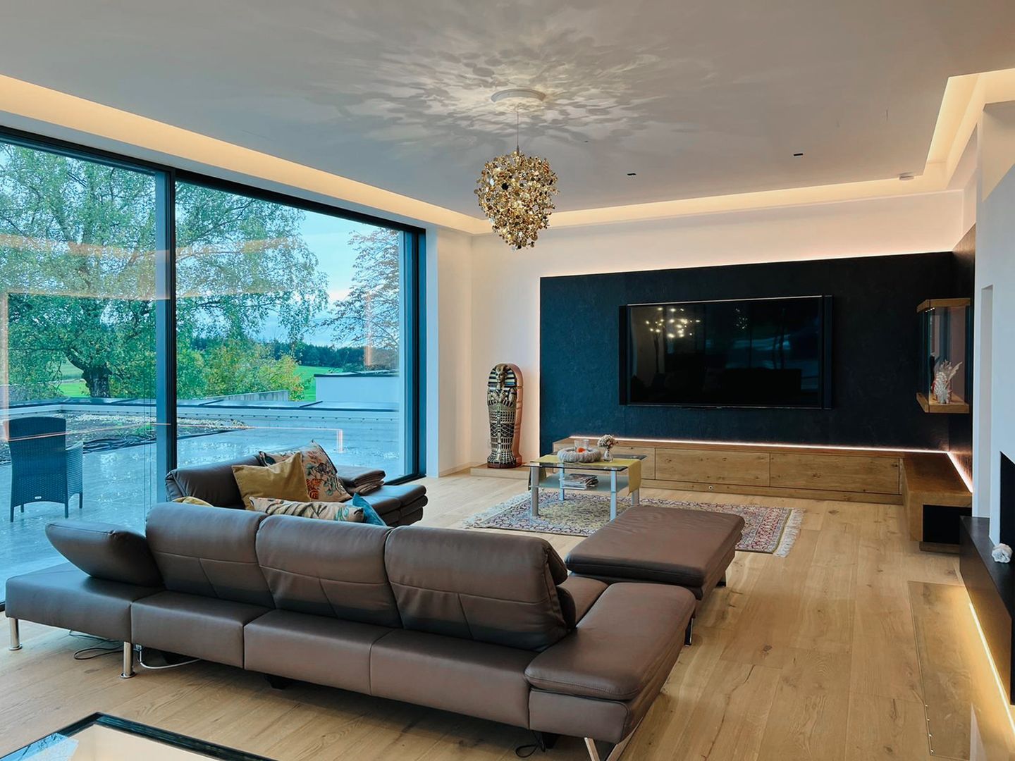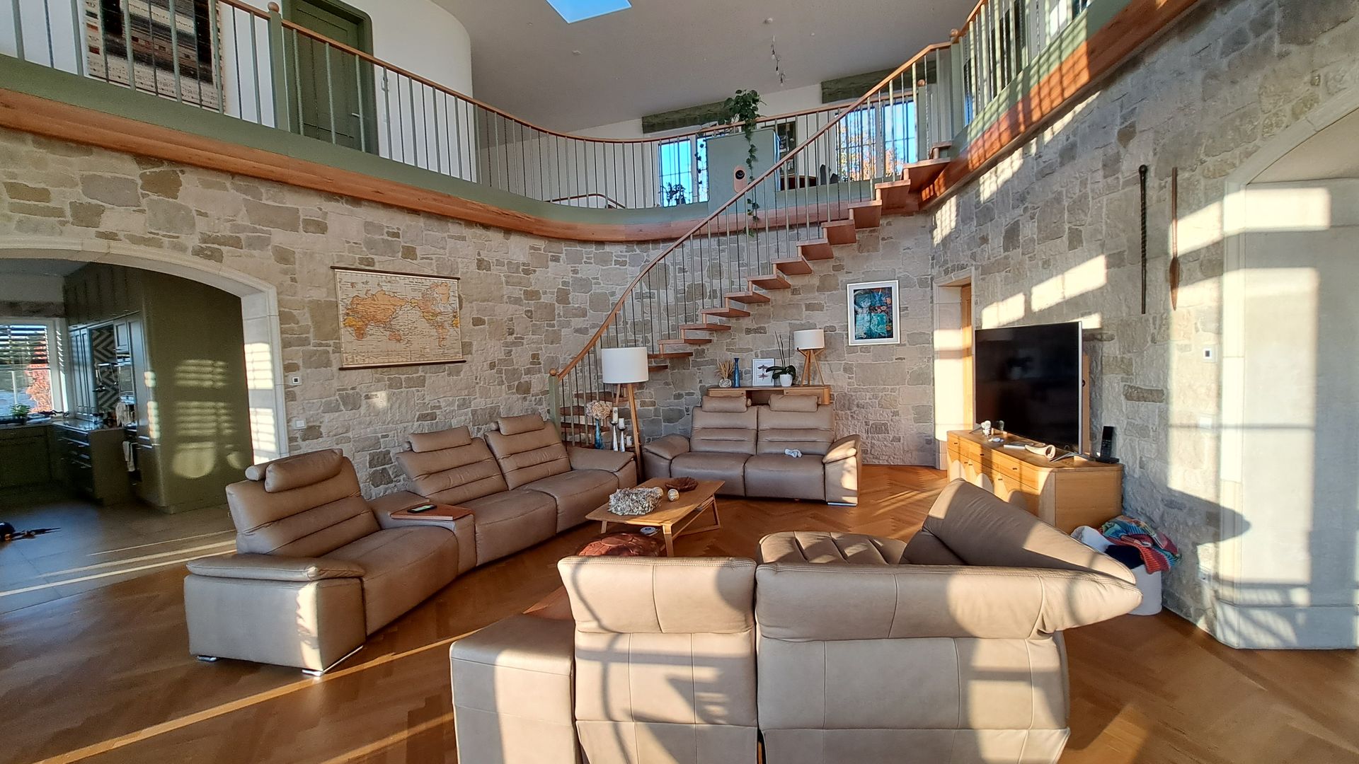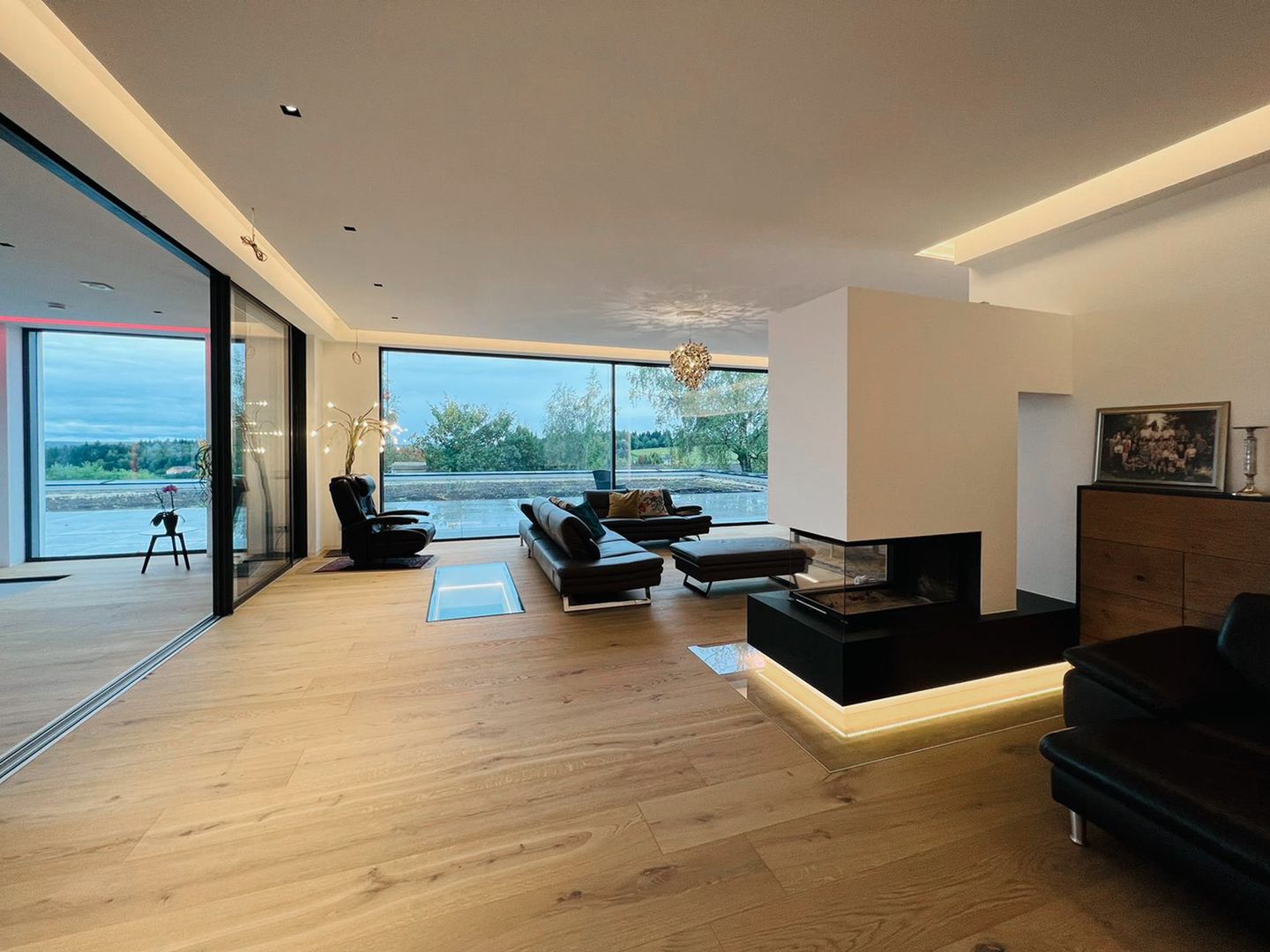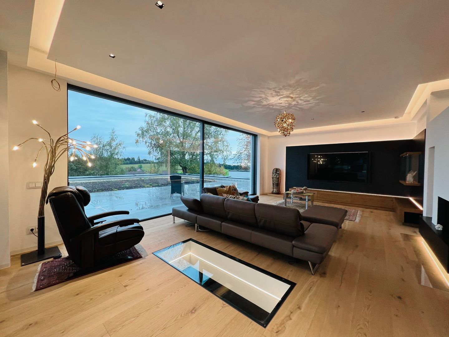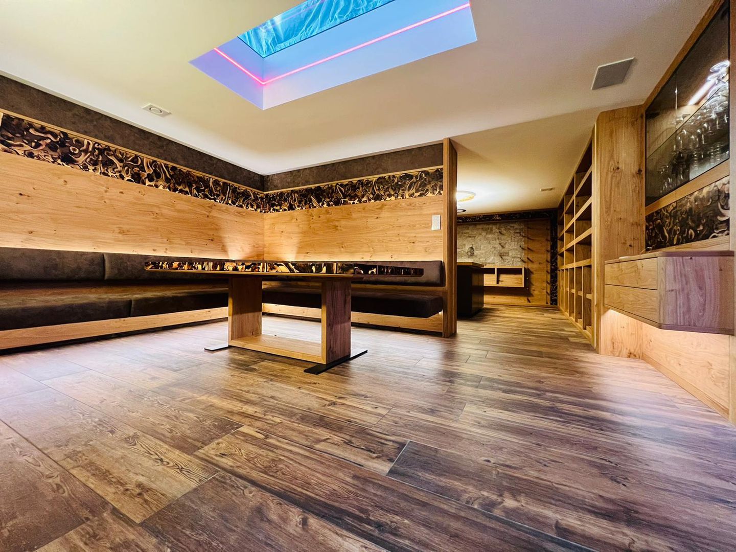 Luxuriöse Wohnzimmerlösung mit Blick in den Weinkeller