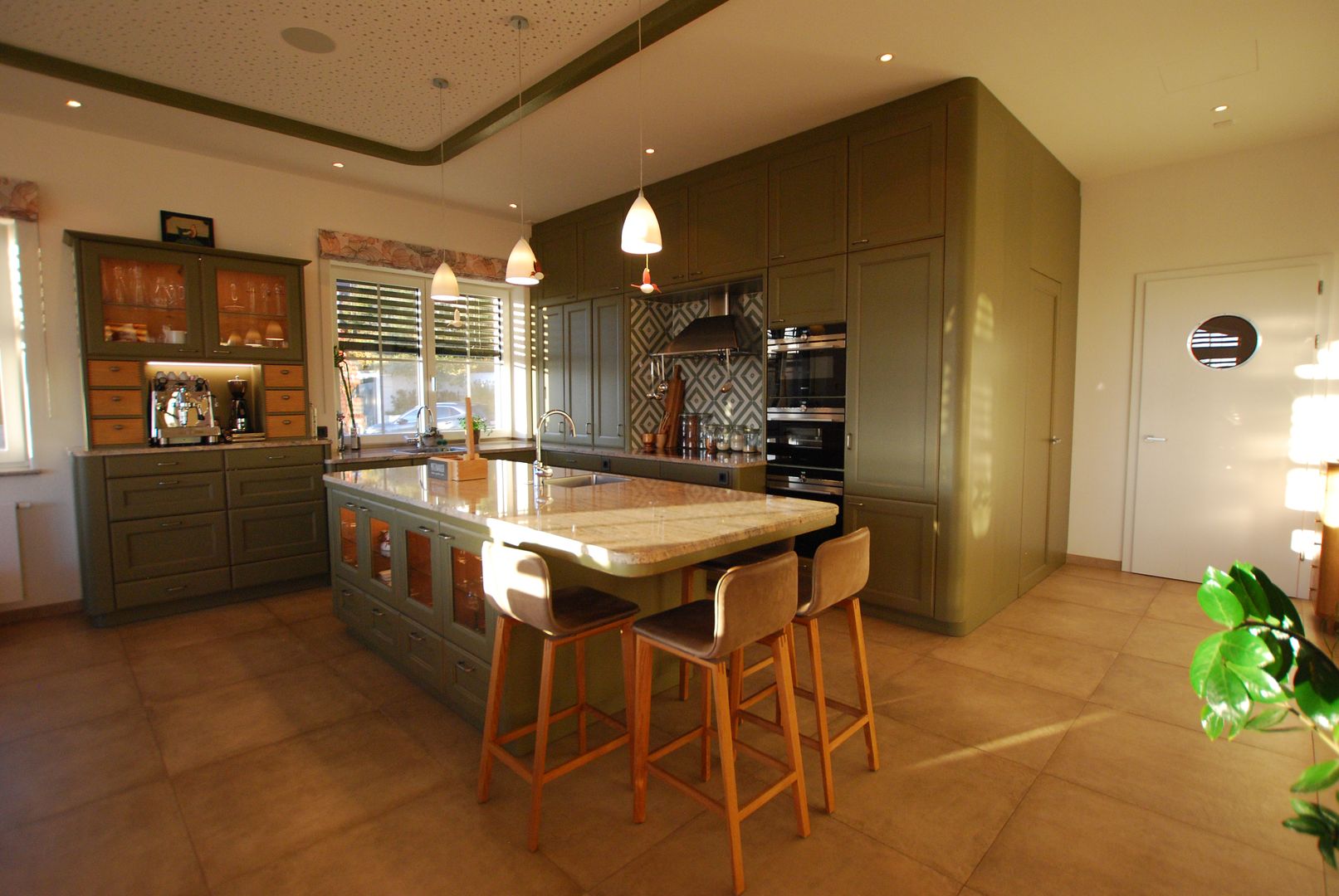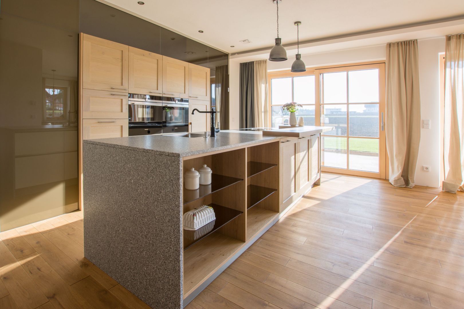Großzügige Küche im Landhausstil mit integrierter Beiküche hinter Glaswand